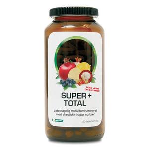 Super+ Total u. jern og K-vitamin – 150 tabletterSuper+ Total uden jern og K-vitamin svarer fuldstændig til den ordinære udgave (Super+ Total), og er på samme måde et multivitamin-/mineralprodukt, der både er letoptageligt og dækker behovet for langt hove (Læs mere)